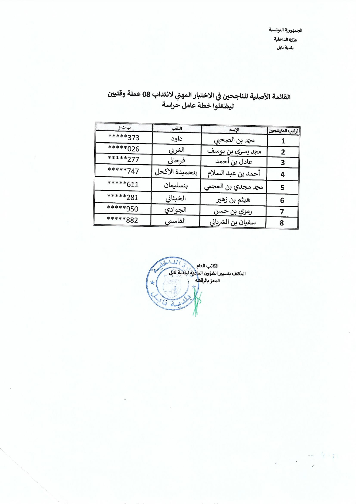 La commune de Nabeul - القائمة الأصلية للناجحين في الإختبار المهني لإنتداب 08 عملة وقتيين ليشغلوا خطة عامل حراسة